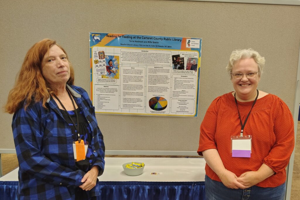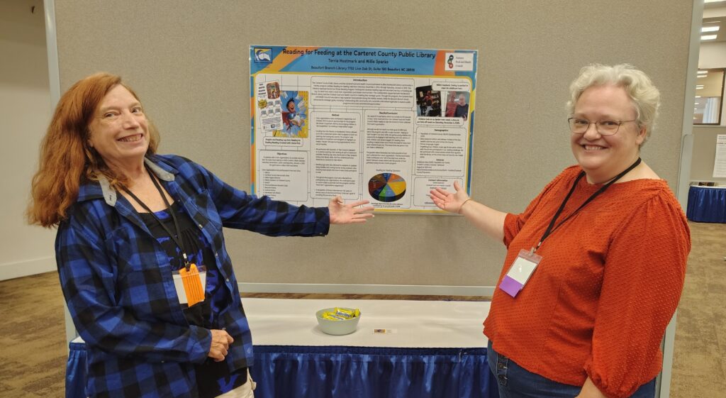 Millie Sparks (representing the Carteret County Public Library) and Terrie Hostmark (representing the Carteret Food and Health Council) participated in the North Carolina Library Association’s Conference to present the Reading for Feeding program. Held last winter, this program brought together 93 eager readers and 10 very generous civic organizations and collected over 600 pounds of food! Many conference attendees stopped by to get more information, what better combination than the love of reading and the desire to help our neighbors fight food insecurity? Keep an eye out for details about this winter’s